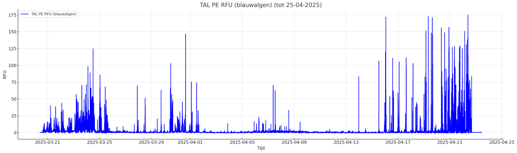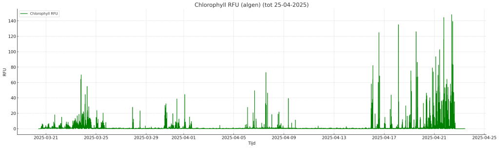The measurement frames have now been hoisted up several times, and the data have been collected multiple times. The accompanying graphs (MPP2, MPP3) show the chlorophyll and blue-green algae concentrations measured by two different EXO probes in the period March/April 2025. Thanks in part to the Observator measuring instruments, Rijkswaterstaat now has a valuable source of measurement data for further analysis.